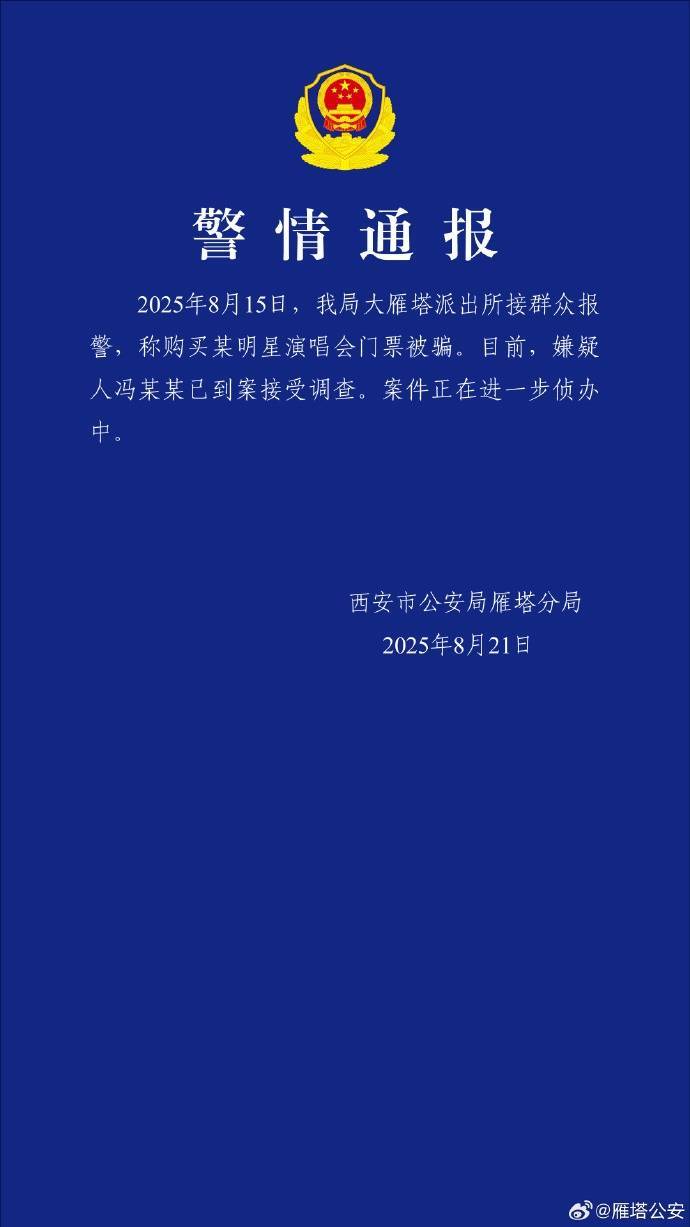 西安市公安局雁塔分局发布通报:2025年8月15日,我局大雁塔派出所接全球报警,称购买某明星演唱会门票被骗。当今,嫌疑东谈主冯某某已到案接管走访。案件正在进一步侦办中。