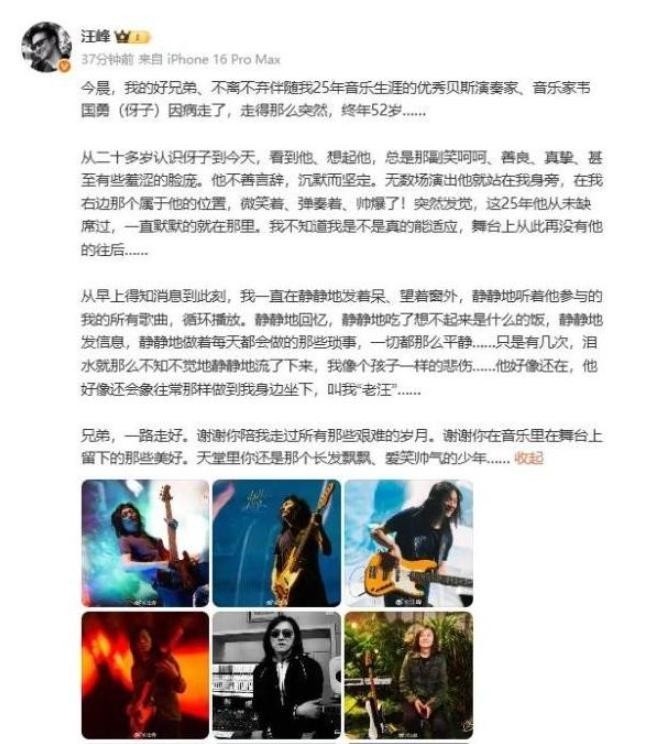 8月17日,他的酬酢帐号终于更新了,但却带来了一个悲讯,追随他25年的音乐东说念主韦国勇的倏得离世了,享年52岁。