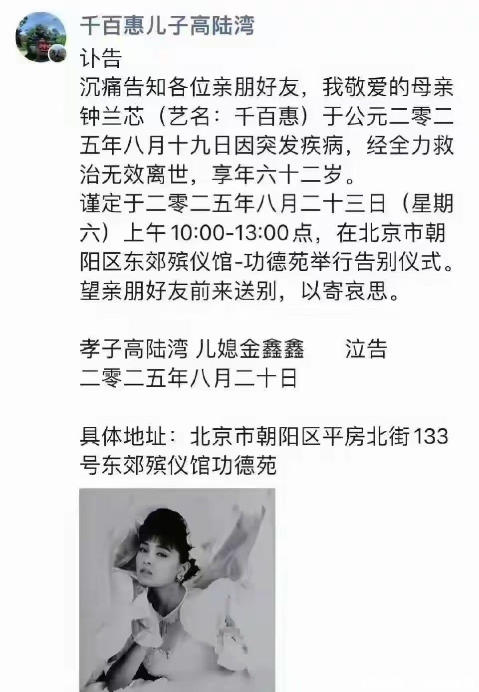 她物化的音尘率先由好友黄安发布讣告,随后她的女儿高陆湾也发布了联系见告,并公布了千百惠的告别典礼时候。